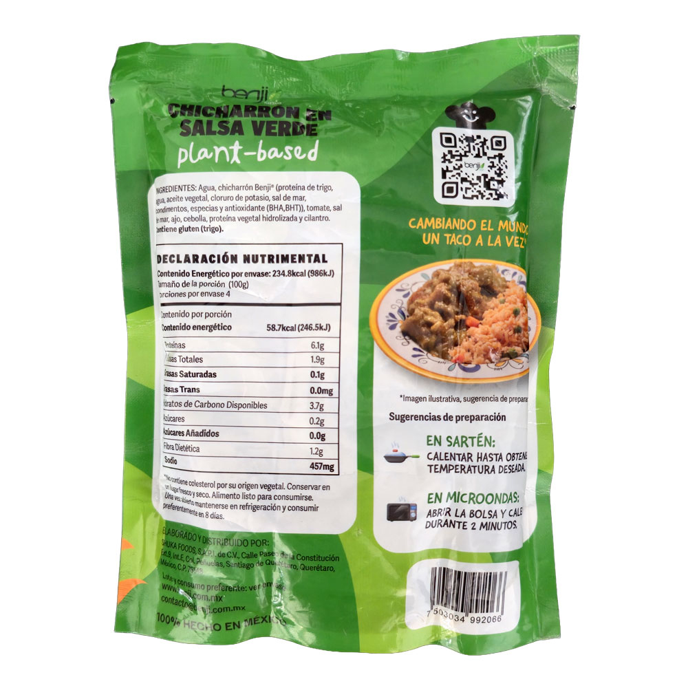 Agua, chicharrón Benji® (proteína de trigo, agua, aceite vegetal, cloruro de potasio, sal de mar, condimentos, especias y antioxidante (BHA,BHT)), tomate, sal de mar, ajo, cebolla, proteína vegetal hidrolizada y cilantro. Contiene Trigo (Gluten).